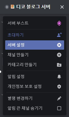 서버의 모든 웹후크를 보려면 맨 위의 서버 이름을 눌러 매뉴를 여신 후 서버 설정에 들어가주세요