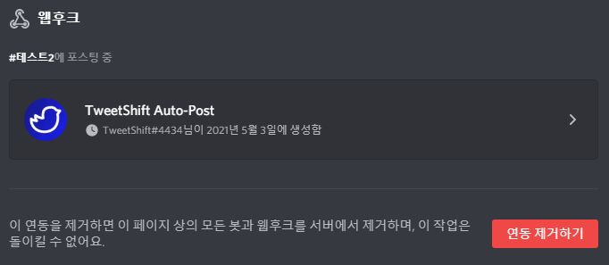 만약 아까처럼 위쪽의 웹후크를 누른다면 유저가 만든 웹후크를 한눈에 볼 수 있습니다. 어디에 포스팅하는지까지 확인이 가능합니다. 클릭하면 해당 항목을 수정할 수도 있고요.