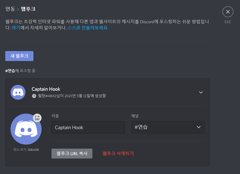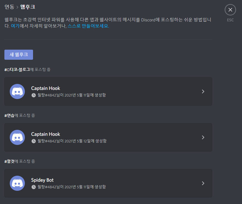 만약 아까처럼 위쪽의 웹후크를 누른다면 유저가 만든 웹후크를 한눈에 볼 수 있습니다. 어디에 포스팅하는지까지 확인이 가능합니다. 클릭하면 해당 항목을 수정할 수도 있고요.