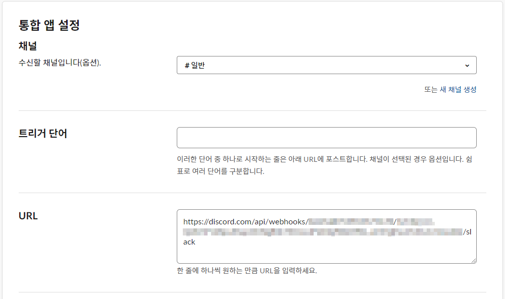채널항목에서 발신할 메시지가 올라오는 채널을 설정하고 (번역에는 수신할 채널로 번역되어 있는데, 번역이 잘못된 것 같아요) URL에 아까 뒤쪽에 /slack을 붙인 디스코드 웹훅 주소를 넣어주세요. 원한다면 트리거 단어를 설정해서 메시지에 특정 단어가 있을 때만 알림이 오게 할 수도 있습니다.