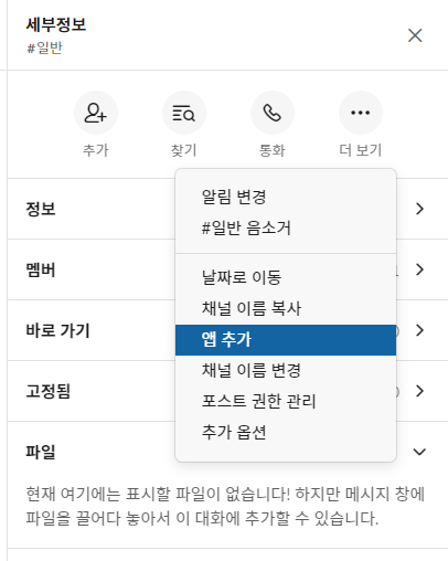 이제 슬랙에 들어가서 채널 오른쪽의 세부정보에 더 보기 > 앱 추가를 눌러줍시다.