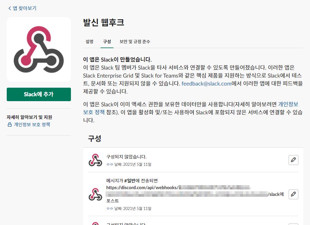 연결해둔 웹훅들을 확인하려면 slack에서 똑같이 발신 웹후크(Outgoing Webhooks)에 들어가 구성을 누르면 연결해둔 사항들이 보입니다.