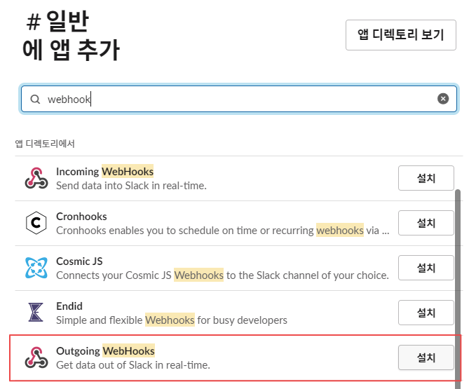 그 후 webhook이라 검색해 Outgoing Webhooks을 선택해주세요. 레거시로 남아있는 기능이라 언제 사라질지는 모르고 쓰는 것을 비추천한다고 하지만 잘 작동합니다.