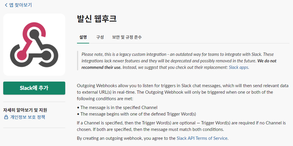다음과 같은 화면이 뜨면 Slack에 추가, 발신 웹후크 통합 앱 추가를 이어서 눌러주세요.