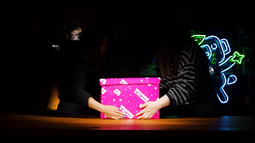 이번에도 첫 번째처럼 둘이서 상자를 들고 오지만, 상자의 색이 핑크색으로 다릅니다.