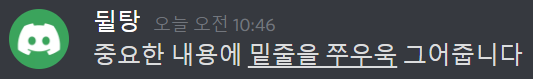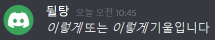 무언가를 정정하고 싶을 때 쓰는 중간선입니다. 양쪽에 물결 표시 두 개(~~)를 붙여 만들 수 있습니다. 디스코드 외의 다른 곳에서는 물결 대신 빼기 부호(-)를 쓰기도 하는데, 여기서는 빼기 부호 대신 물결 부호(~)가 쓰였습니다. 물결 부호는 shift를 누른 채로 키보드에서 ESC키 밑의 가장 좌측 상단에 있는 버튼을 누르면 됩니다.