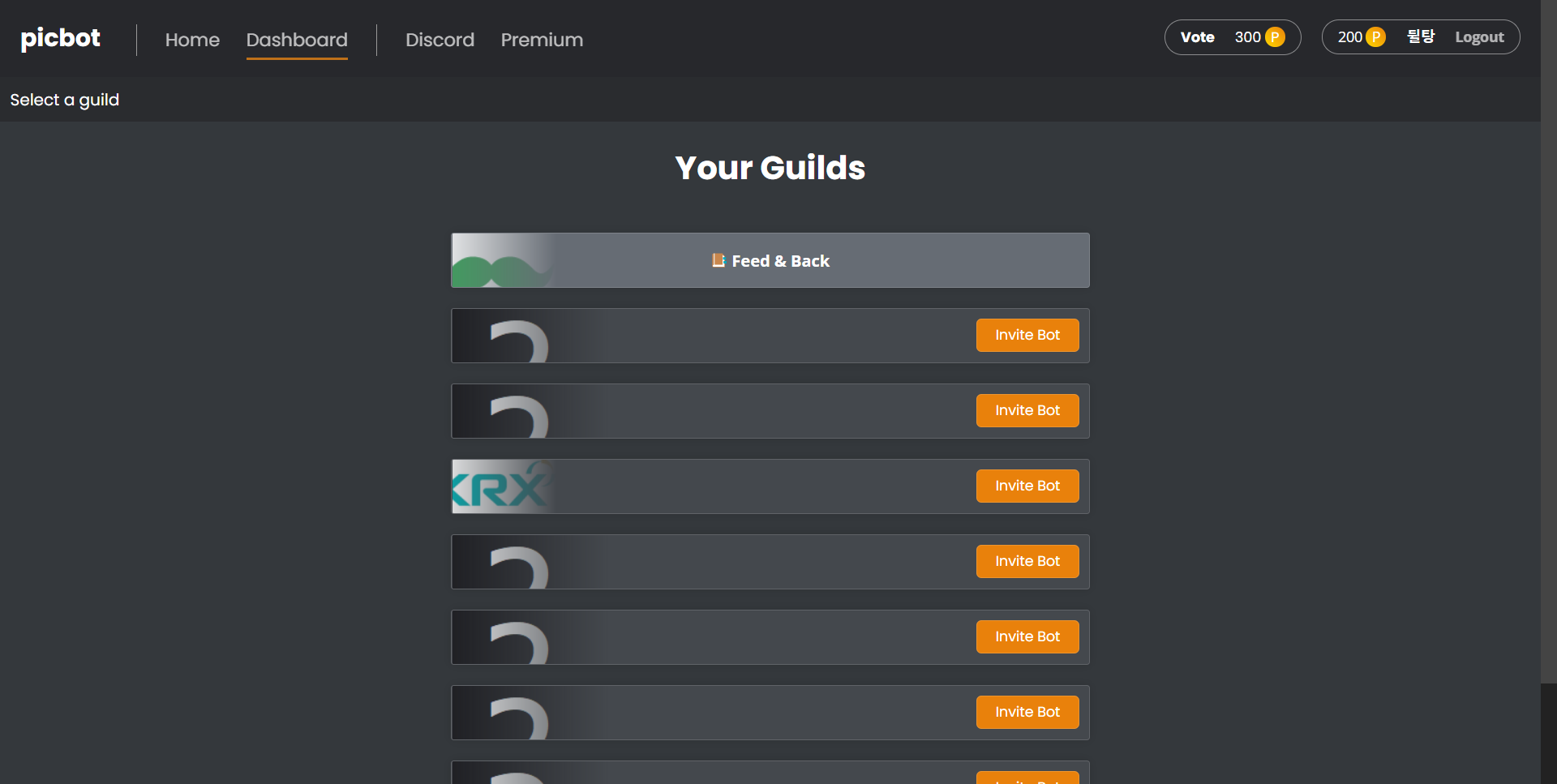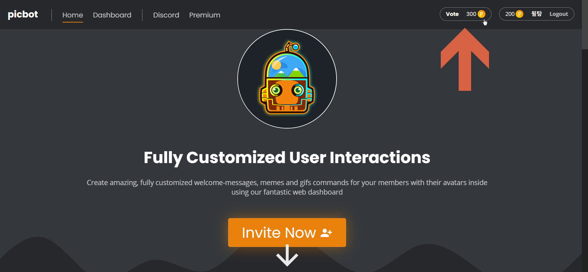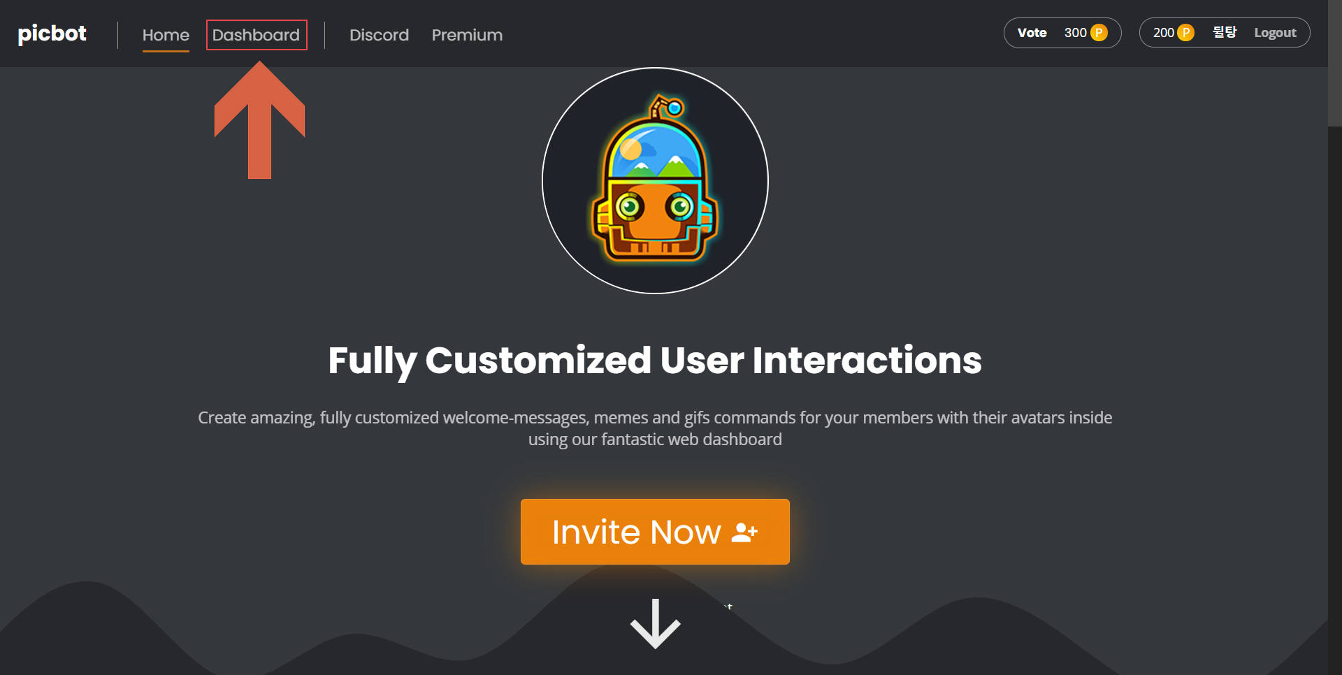 이제 봇을 깔았으면 설정을 해봅시다. 아까 사이트에 다시 들어가서 위쪽의 메뉴에서 Dashboard를 클릭해주세요.