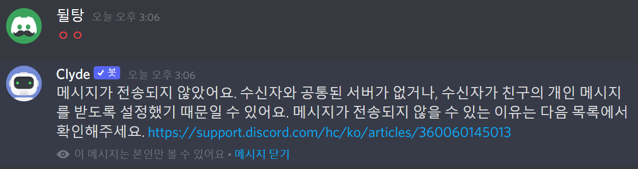 Clyde가 보내는 메시지 전문 메시지가 전송되지 않았어요. 수신자와 공통된 서버가 없거나, 수신자가 친구의 개인 메시지를 받도록 설정했기 때문일 수 있어요. 메시지가 전송되지 않을 수 있는 이유는 다음 목록에서 확인해주세요.