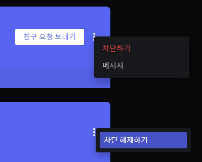 차단하기 전에는 위처럼 메시지를 보내거나 친구 요청을 할 수 있지만, 차단한 후부터는 불가능합니다. 또 서버 초대는 상대방에게 서버 초대 메시지를 보내야 하는 것이기 때문에 특정인에게 서버 초대도 불가능해집니다.