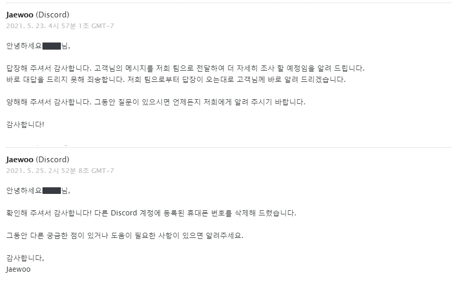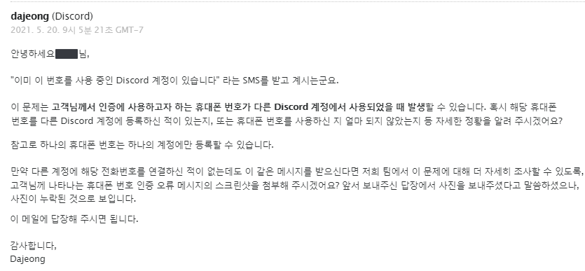 그럼 다음과 같이 디스코드 쪽에서 메일이 오게 됩니다. 다행히도 한글로 메일이 오네요. 연락이 온 메일 주소로 계속 연락하다 보면