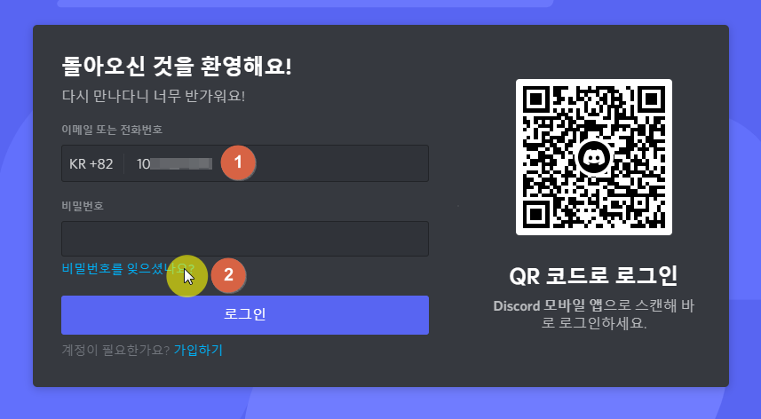 이메일 입력란에 1번처럼 전화번호를 입력하면 자동으로 전화번호용으로 바뀌게 됩니다. 그 후 2번의 '비밀번호를 잊으셨나요?'를 클릭해주세요.