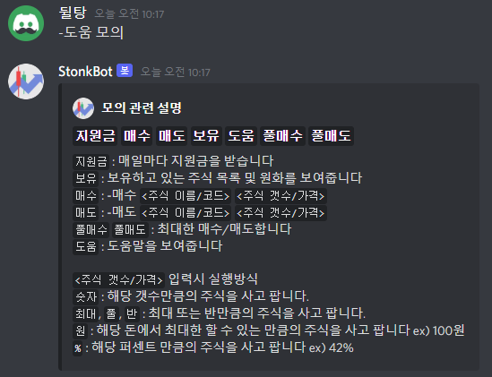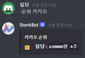 또한 -순위 명령어로 상위 10위의 자산가치를 확인할 수 있습니다. 또한 뒤에 주식명을 붙여 각 주식의 보유수량 순위도 확인할 수 있습니다. 자신의 순위를 보는 기능도 추가할 예정입니다.