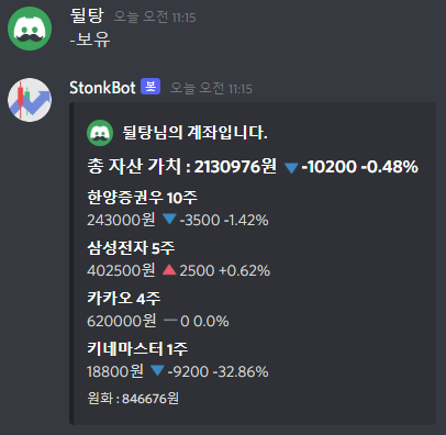 이렇게 산 주식들은 -보유 명령어를 통해 실시간으로 전체 자본을 확인할 수 있습니다. 총 자산가치와 증가 비율 등이 표시됩니다.