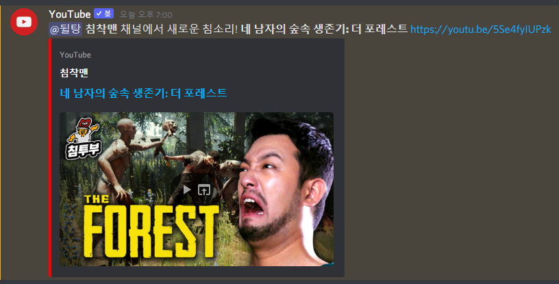 유튜브 봇이 작동하지 않을 때는 아래 유튜브 RSS 주소를 얻는 법과 RSS 알림 봇을 이용해서 대체 가능합니다!