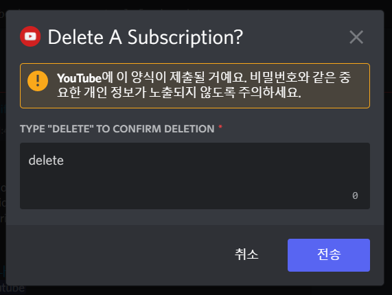 해당 알림을 삭제하고 싶으시면 다음과 같은 창이 나왔을 때 아래에 delete라고 입력해주세요. 그리고 전송을 누르면 해당 알림이 삭제됩니다.
