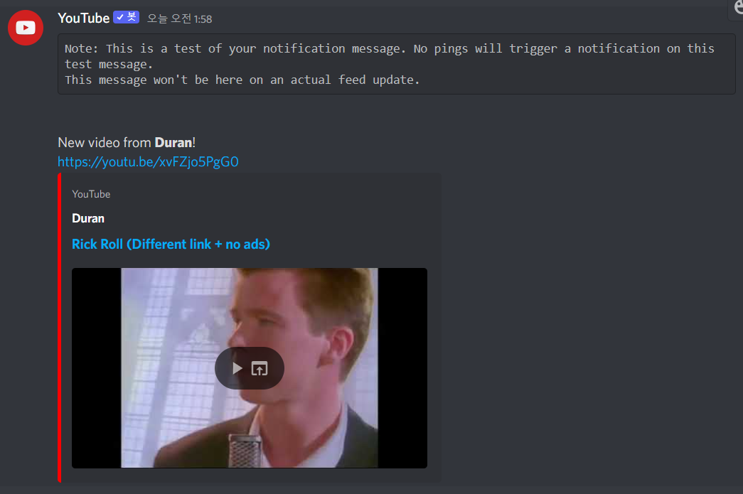 유튜브 알림시에 나오는 문구를 바꾸게 됩니다. 이를 응용하여 동영상이 올라올 때 맨션을 보내게 만들수도 있습니다. 또