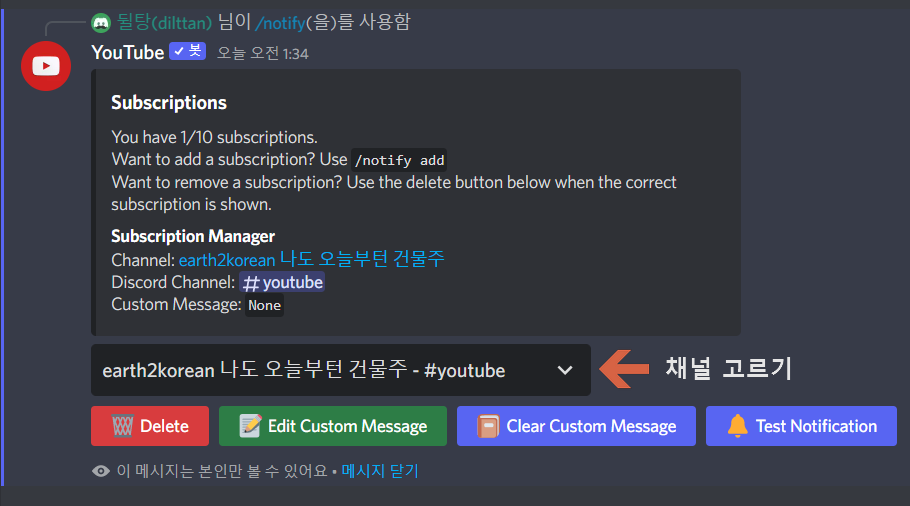 /notify list를 입력하면 추가한 알림들을 확인하실 수 있습니다. 메시지 아래의 선택창에서 추가한 유튜브 채널 알림 중 하나를 고르시면, 해당 유튜브 알림에 대한 정보를 보고 수정하실 수 있습니다.