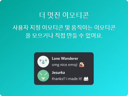 니트로를 구독하면 이모티콘에 관련된 혜택이 두 가지가 있습니다. 첫 번째는 한 서버의 이모티콘을 다른 서버에서도 쓸 수 있다는 점입니다. 두 번째는 움직이는 이모티콘(gif)이 사용 가능해집니다!