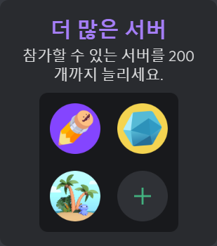 니트로 구독 전에는 최대 100개의 서버에만 들어가 있을 수 있었습니다. 그래서 새로운 서버에 들어가려고 하면 기존에 들어갔던 서버에서 나가야지 가능했었어요. 니트로 구독을 하게 되면 최대 200개의 서버에 들어갈 수 있게 바뀝니다! 디스코드를 헤비 하게 이용하는 분께 유용할 듯싶네요.