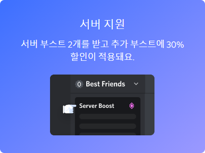 니트로 클래식이 아닌 일반 니트로를 구독하면 서버 부스트 2개가 생기게 됩니다. 서버 부스트를 서버에다가 주면 레벨이 오르고, 레벨에 따라 오디오 품질이 오르거나 서버 이모티콘 추가, 서버 꾸미기 기능 추가 등의 혜택이 있어요. 부스트 2개면 레벨 0 서버를 레벨 1로 만들 수 있습니다. 서버 레벨 1이 되면 무엇이 바뀌는지는 아래에 후술 할게요. 부스트를 원하는 서버에 한번 지원해보세요!