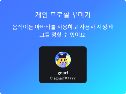 개인 프로필 꾸미기에 관한 니트로 혜택은 크게 3가지가 있습니다. 디스코드 아바타로 움직이는 사진(gif)을 사용할 수 있으며 뒤의 태그(#뒤의 숫자)를 자기 마음대로 바꿀 수 있습니다. 또 프로필 배경도 바꿀 수 있게 됩니다.