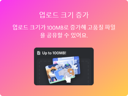 디스코드의 기본 업로드 파일 크기 제한은 8MB입니다. 택스트 파일을 올리기에는 적당하지만 큰 사진이나 움짤을 올릴 경우에는 쉽게 8MB가 넘어가져 버리죠. 니트로를 사용할 경우에는 이 제한이 100MB까지 확장이 됩니다! 따라서 쉽게 용량이 큰 움짤이나 동영상을 올릴 수 있게 돼요.