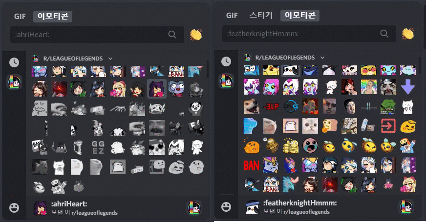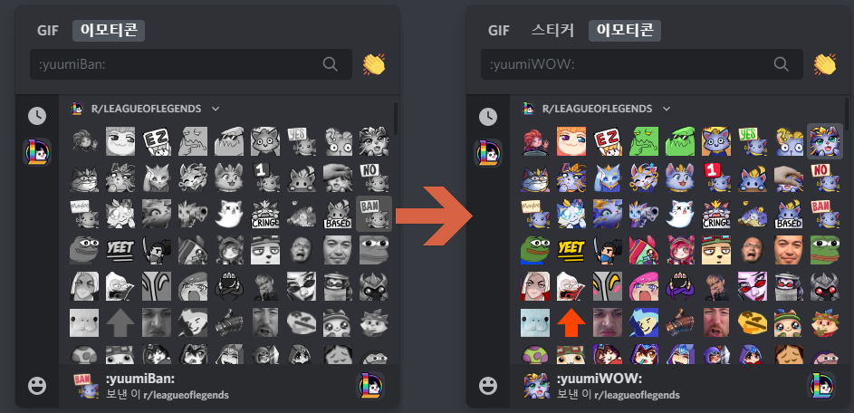 왼쪽처럼 다른 서버에서는 사용 불가능 했던 서버 전용 이모티콘들이 오른쪽처럼 사용가능하게 바뀝니다! 니트로를 구독 중이라면 재밌는 이모티콘을 쓰기 위해서 다른 서버로 들어가보세요. 만약 맘에 드는 이모티콘이 없다면 자신이 서버를 만들고 원하는 이모티콘을 등록해도 됩니다!