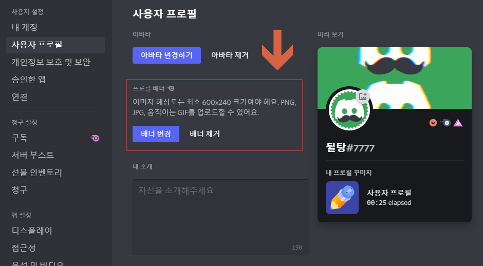 적용 방법은 그냥 아바타를 변경하는 법과 똑같습니다. 사용자 설정의 사용자 프로필에 들어가서 화살표가 가리키고 있는 아바타 변경하기를 눌러주세요. 아바타 변경시 gif 파일을 업로드해주시면 됩니다.
