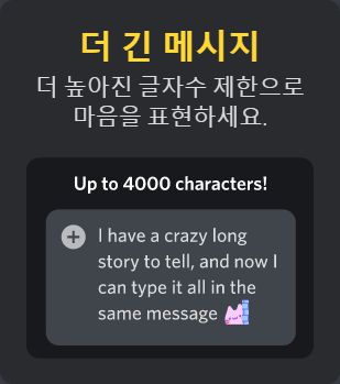 니트로 구독 전에는 글자 수 2000자 제한이 4000자까지 늘어납니다. 니트로가 없어도 2000자가 넘으면 아래의 파일로 보내기를 누르면 첨부파일 형태로 보내지기 때문에 개인적으로는 끌리지 않네요.