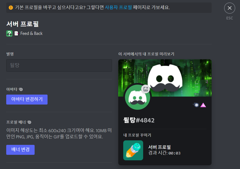 이렇게 적용된 프로필과 태그, 프로필 배경은 니트로가 끝나면 되돌아오게 됩니다. 프로필은 움직이지 않게 바뀌고 태그는 랜덤으로 다른 태그가 부여됩니다.
