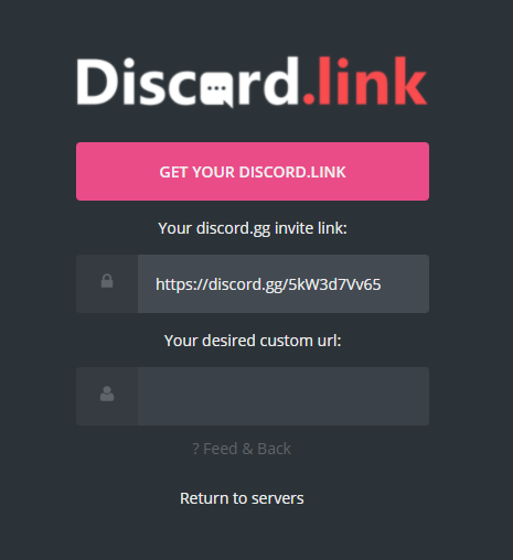 그럼 위쪽에는 기존 초대링크를 입력하고 아래쪽에는 원하는 커스텀 url을 입력하는 창이 뜹니다. 둘 다 입력하고 GET YOUR DISCORD.LINK를 클릭해주세요.