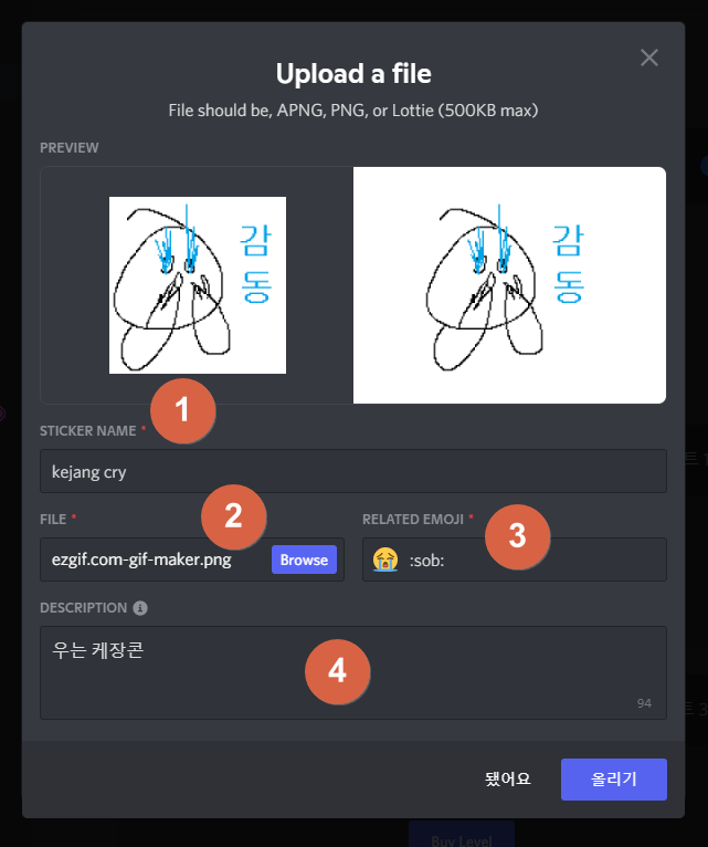 커스텀 스티커는 서버 부스트가 1레벨 이상이어야 할 수 있어요.