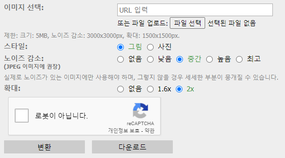 이미지 선택에서 URL를 입력하거나 파일 선택을 하고, 스타일에서는 그림인지 아니면 사진인지 선택해주세요. 사진일경우 변환했을 때 조금 뭉개질수 있습니다. 노이즈 감소에서는 사진이 너무 풍화되었다 했을 때 선택해주세요. 마지막으로 확대하고 싶을때는 아래 확대 정도를 선택해주세요. 로봇이 아닙니다.를 확인하고 난 뒤에 변환을 누르면 기다린 후 사진이 바로 보이고, 다운로드를 누르면 바로 다운로드가 가능합니다! 다운로드 된 PNG 파일을 스티커를 만들 때 써주세요.
