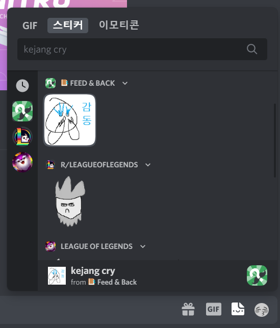디코 스티커가 드디어 업데이트되었습니다! 디스코드 스티커는 위와 같이 카톡처럼 움짤이나 그림 이모티콘을 올릴 수 있는 기능입니다. 이전에 있던 디스코드 이모지보다는 크기가 커요. 위와 같은 움직이는 이모티콘을 자기 마음대로 서버에 추가해서 사용할 수 있습니다! 이제 이런 커스텀 스티커를 추가하고 사용하는 법에 대해 알아봅시다.
