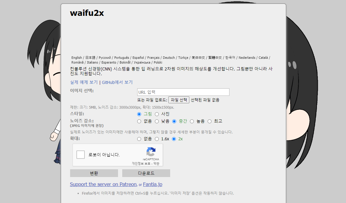 JPG를 PNG로 변환하려면 일반 변환 사이트를 이용해도 되지만, 개인적으로는 Waifu2x라는 사이트를 추천합니다. Waifu2x에서는 인공지능으로 사진의 크기를 키워주고 노이즈를 없애주기 때문입니다.