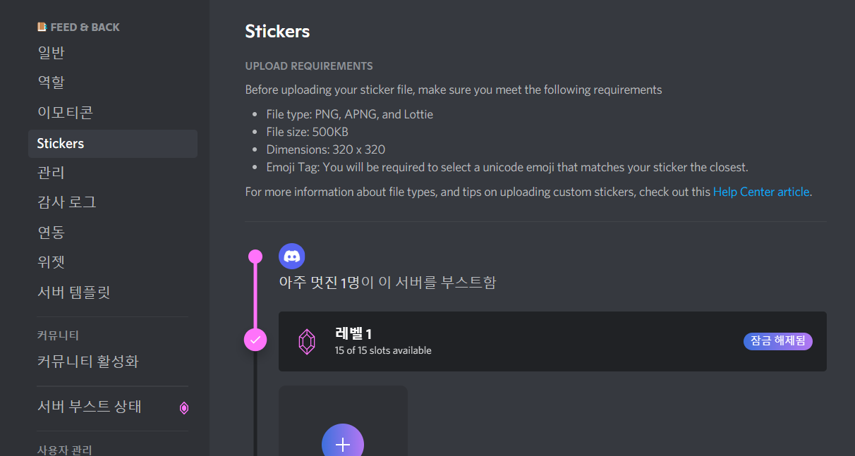 커스텀 스티커는 서버 부스트가 1레벨 이상이어야 할 수 있어요.