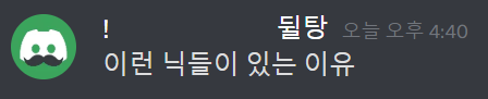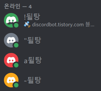 디코 닉네임 정렬 순서가 아스키코드 순서라는 것을 이용하면 여러 가지 다른 일도 가능합니다. 예를 들어서 자신의 닉을 느낌표 닉 바로 뒤쪽에 두고 싶다면 닉네임 앞에다가 큰따옴표(")를 붙이면 됩니다. 또 자신의 닉을 영어 닉들보다는 뒤쪽에 두고 싶지만, 한글 닉보다는 앞에 두고 싶다면 닉네임 앞에다가 물결 표시(~)를 붙이면 됩니다.