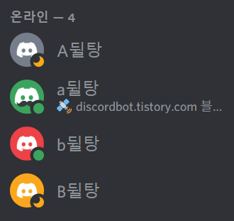 위에서는 정렬순서가 아스키 순서와 비슷하다고 말했지만, 영문자 순서에서는 다른 점이 있습니다. 아스키코드에서는 대문자가 모두 나온 후에 소문자가 나옵니다. 같은 대소문자 안에서 알파벳 순서로 배열되는 거죠. 하지만 디스코드 닉네임에서는 기본적으로 알파벳 순서를 기준으로 배열됩니다. 대소문자는 따지지 않습니다.