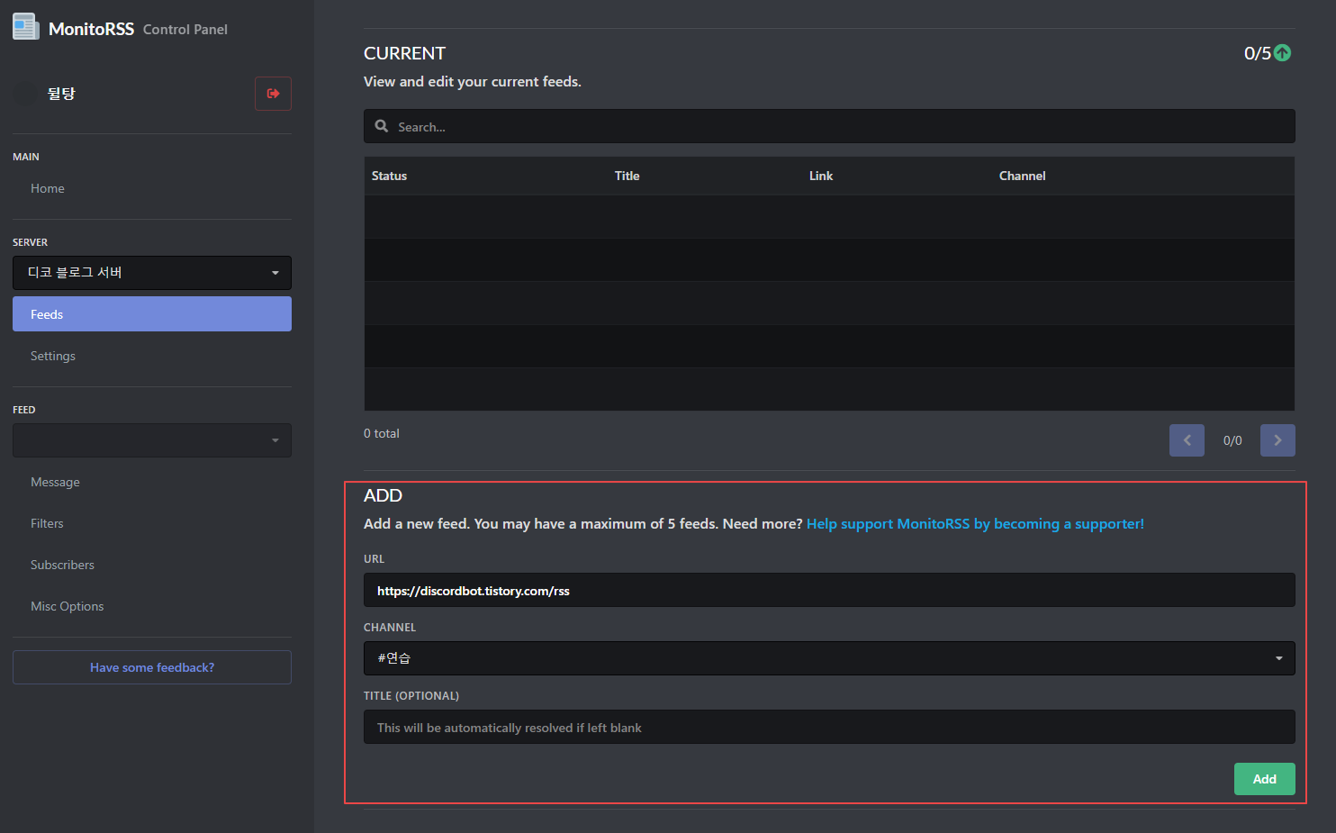 다음과 같이 빈칸에 RSS URL과 올라올 채널을 설정해주시고 Add를 눌러주시면 됩니다.
