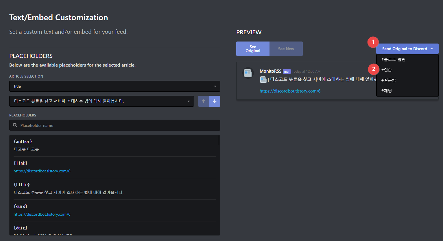 이후 다음과 같으 화면이 뜨는데, 1번의 Send Original to Discord를 클릭하고 나오는 창에 보낼 채널을 설정해주시면 됩니다.
