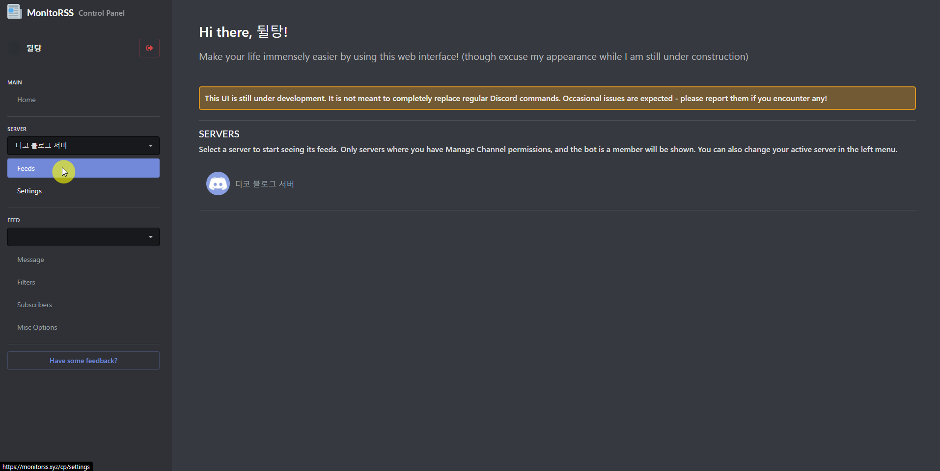 들어오셨다면 이런 화면이 뜹니다. 가운데에는 봇을 추가한 서버 목록이 보이네요. 이제 왼쪽에서 서버를 선택해주신 다음 Feeds를 눌러주세요.