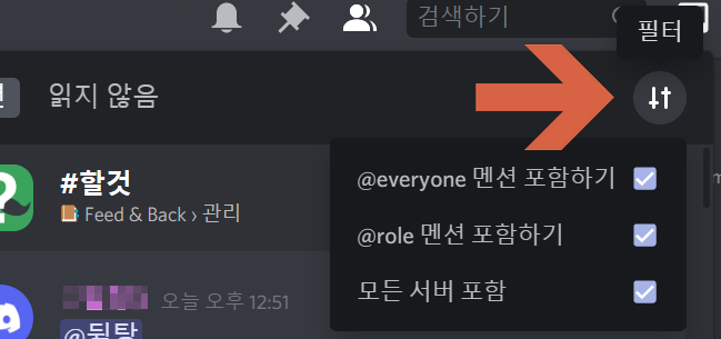 멘션 보기에서는 오른쪽 위에 필터 설정이 있으며 @everyone 멘션을 볼지 안 볼지, @역할로 언급된 멘션을 볼지 안 볼지 선택할 수 있습니다.