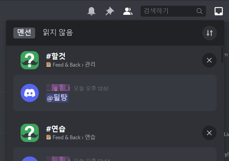 멘션 화면에서는 모든 멘션들을 한번에 서버별, 채널별로 볼 수 있습니다.