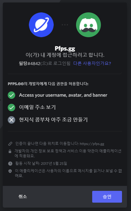 그 후 위와 같은 화면이 나왔을 때 승인을 눌러주면 디스코드 아이디로 로그인이 됩니다.