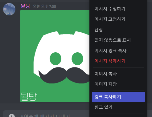 디스코드 이미지는 이미지를 우클릭 후 링크 복사하기를 클릭하면 얻을 수 있습니다.