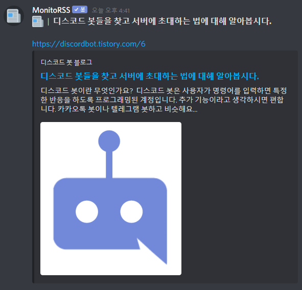 그러면 다음과 같이 디코에 블로그 알림이 뜨는 것을 확인할 수 있습니다.