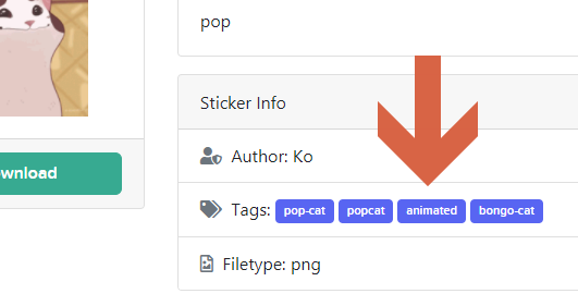 혹시 비슷한 느낌의 다른 스티커를 찾고 싶으시다면 오른쪽의 태그를 클릭해주세요. 태그를 클릭하면 해당 태그를 가지고 있는 다른 스티커들을 찾아줍니다. 태그 중에 animated라는 태그는 이 스티커가 움직이는 움짤 스티커라는 뜻입니다. 따라서 움직이는 스티커만 보고 싶다면 animated 태그를 눌러주세요!