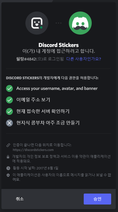 다음 화면에서 승인을 눌러주시면 디코 아이디로 사이트에 로그인이 됩니다.