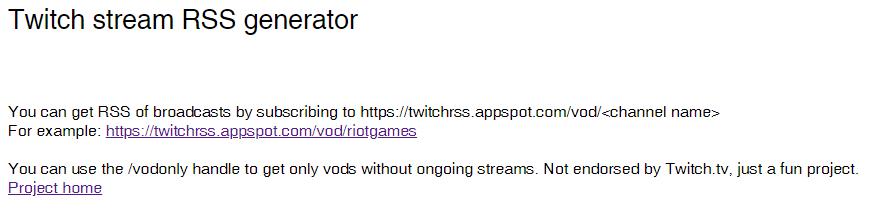 이 RSS 서비스는 트위치에서 공식으로 제공하는 것이 아닌 유저가 만든 서비스입니다. 해당 서비스에 대해 더 많은 정보를 알고 싶으신 분들은 아래 링크로 들어가주세요.