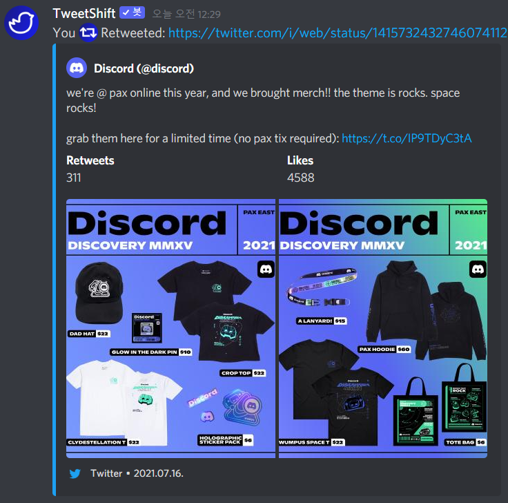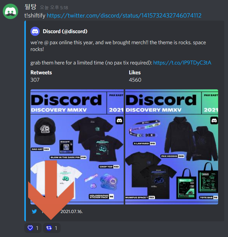 디스코드에서 좋아요, 리트윗 하기 - t!shiftify <트윗 주소>